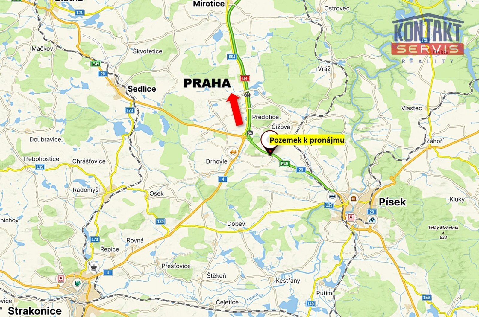 - Přímo u dálnice ve směru Písek – Praha