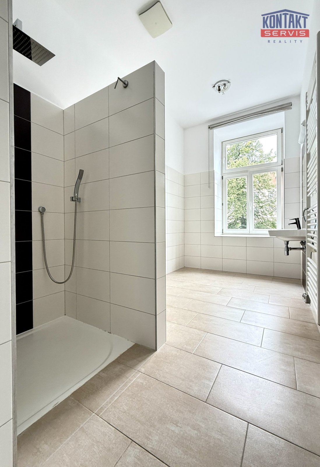 která nabízí vstup do elegantní koupelny s umyvadlem, sprchovým koutem a
